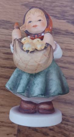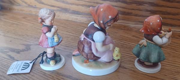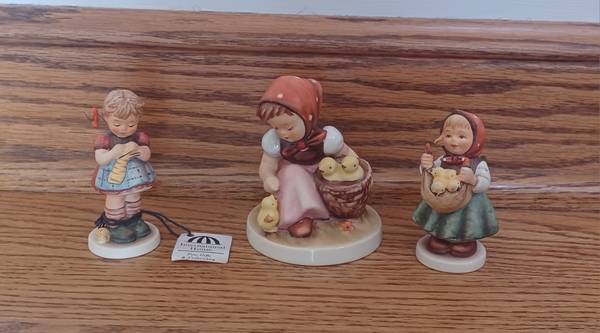 Goebel MJ Hummel figurines made in Germany from $12 to $42 each. Stitch 'n Time, new and signed 1987 number 255, 3.25 inches high for $42. Chick Girl 1979 number 573, signed, 3 3/4 inches high for $27. Girl with baby chicks, 1987, number 385, signed for $12. All in excellent, like new condition, except stitch 'n time is brand new. No chips, cracks, or breaks. Near Route 60 and Peterson Road in Unincorporated Grayslake.