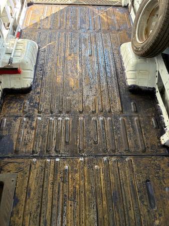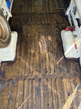 I bought this Transit about a year and a half ago with the intention of converting it to a camper van. However, I am now financially unable to complete the project. In the cargo area, the floor pans had a good amount of surface rust with a few tiny holes. After seeing a few body shops to have the holes patched, they all suggested cleaning up, patching the holes, adding a rust inhibitor/converter, and adding a bed liner. A typical my loss is your gain scenario.