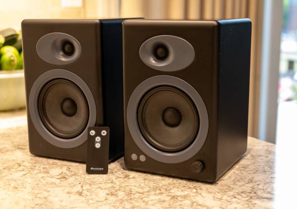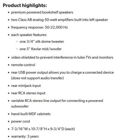 Lightly used in an executive office setting as computer speakers - these were never even played loudly out of respect to my neighbors at work. Selling due to an office remodel and going in a different direction for sound. Bought new from Crutchfield. These are $399 / pair today. Includes wireless remote and power cord. Perfect for computer use, for a small listening room with a turntable or other source. 100 watts total power (50x2). They do not come with speaker grilles or covers (they're not missing - they don't come with the speakers when new).