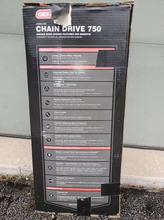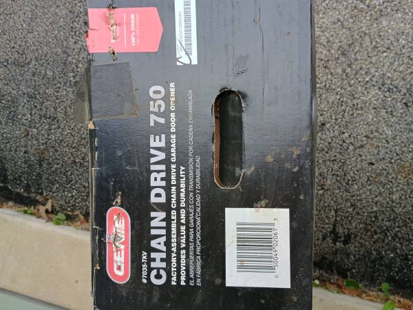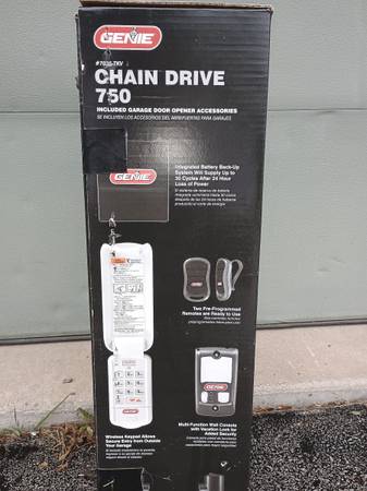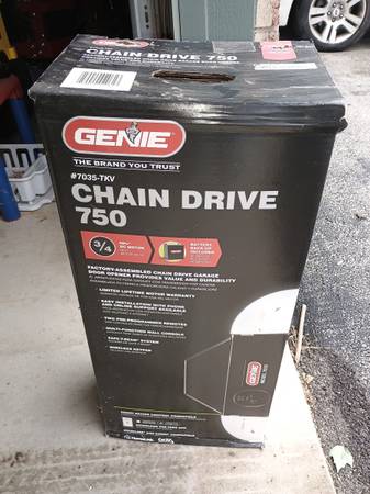 New in box - box has been opened Genie 3/4 HP Model 7035 TKV DC motor Chain drive 2 remotes 1 multi function wall console 1 wireless keypad for secure entry from outside garage Homelink and car2u...