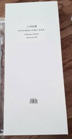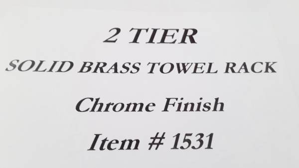 New in original box, Gatco fine bathroom fixtures, hotel quality 2 tier solid brass towel rack, chrome finish, item number 1531. 26.5 in long by 8.85 in high by 9 in deep. Includes 4 wall brackets, screws, etc. There are 2 sets available at $20 per set.