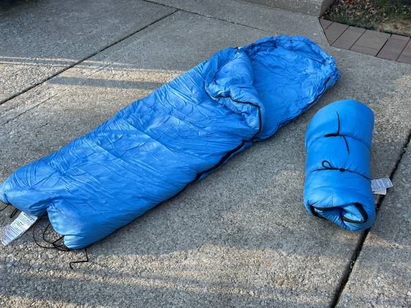 2-Like New Sportline Brand Goose Down Adult Mummy Sleeping Bags, Non Tear Nylon exterior, Face Drawstrings, Blue in Color, Very comfy, Northwoods Model, Good to 10 Degrees above!!! Selling for $75.00 each, Senior Owned, Please Call Dan at show contact info
