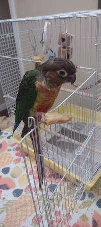 tame and sweet green cheek pineapple conure w/cage and accessories