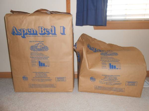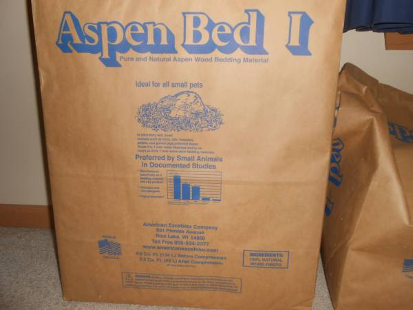 Aspen Bed I, wood bedding for small pets, 1 unopened bag and about a quarter left in the open bag. Total weight of the 2 bags is 36 pounds. Smoke free, pet free home.