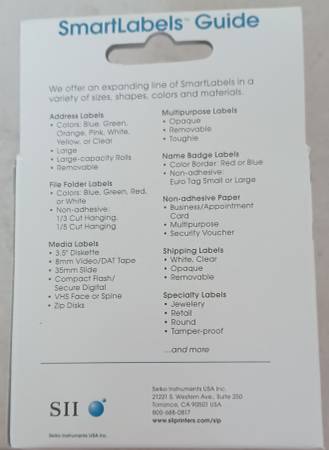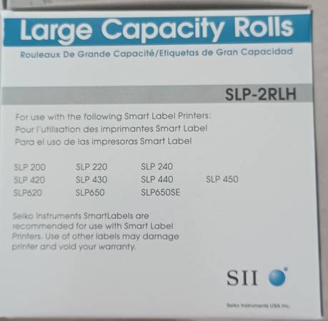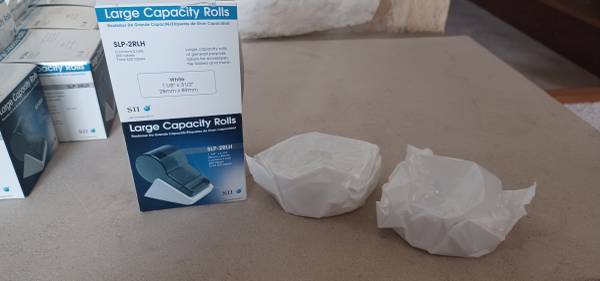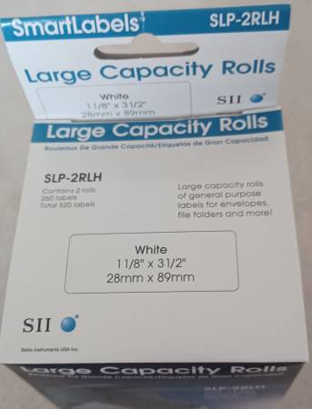 Large capacity white SLP 2RLH rolls for smart label printer. Labels are 1 1/8 inch by 3 1/2 inches. 2 sealed rolls per box, 5 boxes total at $10 each box. Each box has 520 labels. Near Fairfield...