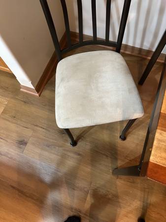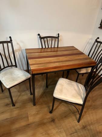 Great condition very little blemishes very solid table with four chairs. Chairs have velvet like seats. Thanks