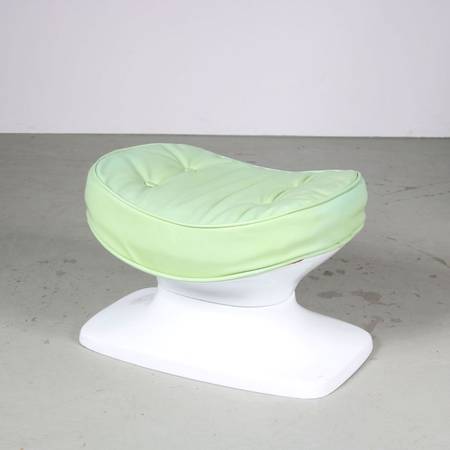 A rare “Alpha Egg Chair” manufactured by Lee West in the USA around 1970. This iconic chair was a must have at it’s time and has now become a rare mid-century classic! Made of white ?? holding the lime green upholstered seat and cushions. The same materials are used for the matching stool, making this a fantastic set! The unique feature of this piece are the built in speakers on the inside of the pod, which creates a unique audio experience when seated! The shape of the shell not only provides seating comfort, but also really adds to the sound as it blocks external sounds and really provides support for the acoustics. all together this is just an exquisit find that will be a valuable addition to any decor, guaranteed to draw the attention! The sizes of the chair: W. 100 x D. 105 x H. 130 (SH. 43) cm The sizes of the stool: W. 53 x D. 41 x H. 34 cm Sold as a set, the price is for the chair and ottoman together! It remains in very good, vintage condition with minor wear consistent with age and use, preserving a beautiful patina.