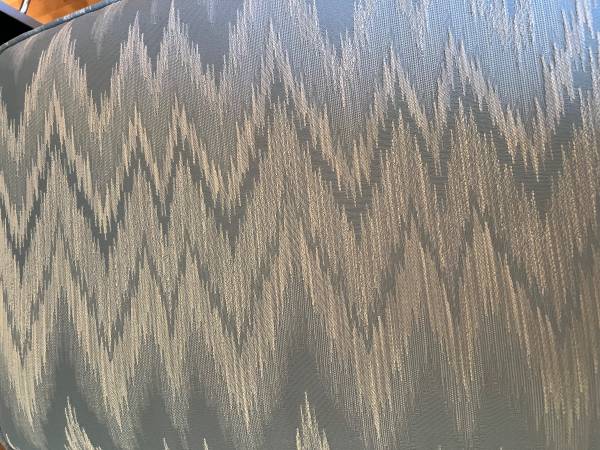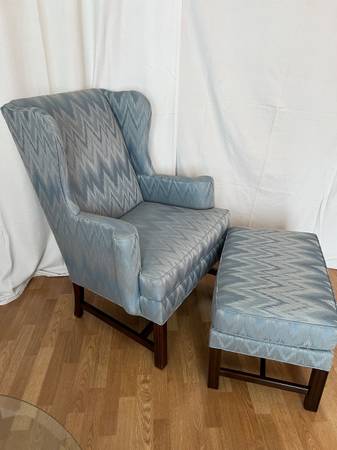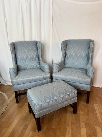 Two Drexel Heritage Blue Moray High Back chairs with Wings and matching foot stool. IN EXCELLENT CONDITION! Comes with 4 matching armrest covers.