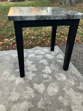 Entire living room set includes slate grey area rug and faux granite coffee table and two end tables. Coffee table 3’11”long, 2’wide and 1’7”tall. End tables are 2’11”X1’10”and 2’ tall. Rug is...
