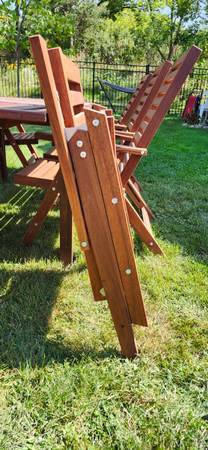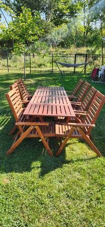 Outdoor Patio Table with 8 folding chairs. This table can be 4.7 feet or 8.6 feet long. It measures 30'' wide. Perfect for intimate or big gatherings. Comes with 8 chairs that fold and stack upon each other. Table has leaves that hide under the table and slide out to extend when needed. Opening in middle of table for an umbrella. In excellent condition.