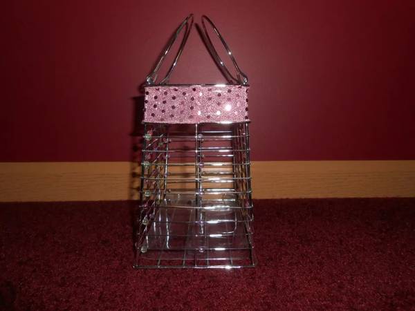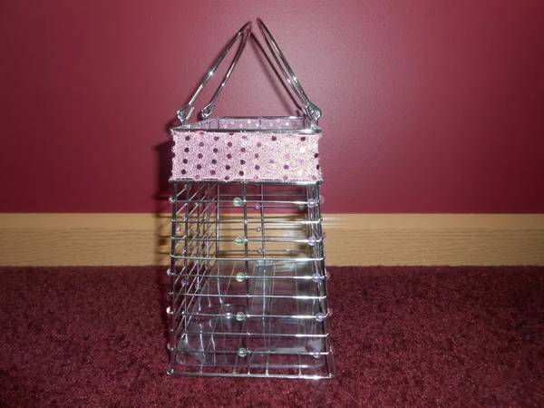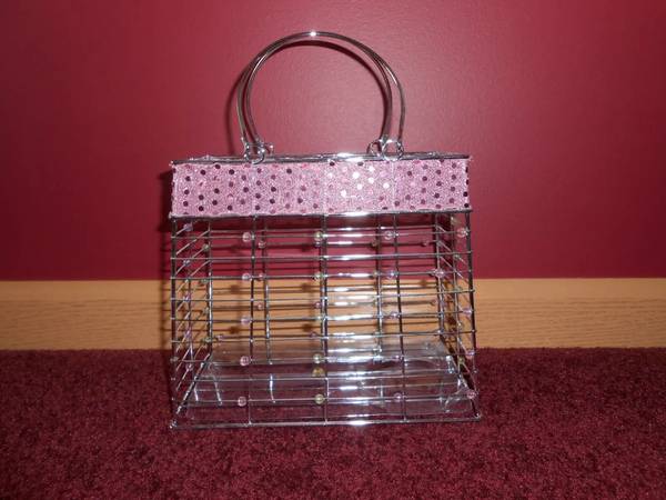 Metal/Beaded Makeup Gift Set Bag/Purse 9" x 5" x 7". The front & back of the bag is made with 12 horizontal metal bars with 4 white or pink beads on it, and 5 vertical metal bars. The bottom of the bag has 6 metal bars and the sides have 12 bars across (w/beads) and 3 vertical metal bars. There is a plastic tray in the bottom of the bag, but the rest of the bag is COMPLETELY OPEN. The top of the bag is accented with a 1.5" pink chiffon ribbon with metallic pink polka dots. Metal double handles would add 4" to the height. Nice bag for gifting. Smoke free, pet free home.