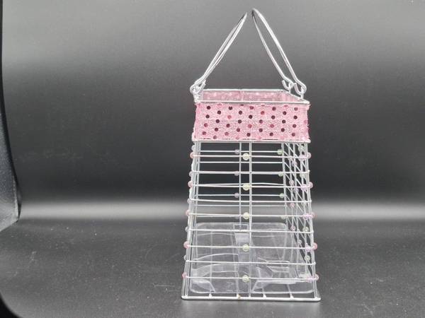 Metal/Beaded Makeup Gift Set Bag/Purse 9" x 5" x 7". The front & back of the bag is made with 12 horizontal metal bars with 4 white or pink beads on it, and 5 vertical metal bars. The bottom of the bag has 6 metal bars and the sides have 12 bars across (w/beads) and 3 vertical metal bars. There is a plastic tray in the bottom of the bag, but the rest of the bag is COMPLETELY OPEN. The top of the bag is accented with a 1.5" pink chiffon ribbon with metallic pink polka dots. Metal double handles would add 4" to the height. Nice bag for gifting. Smoke free, pet free home.