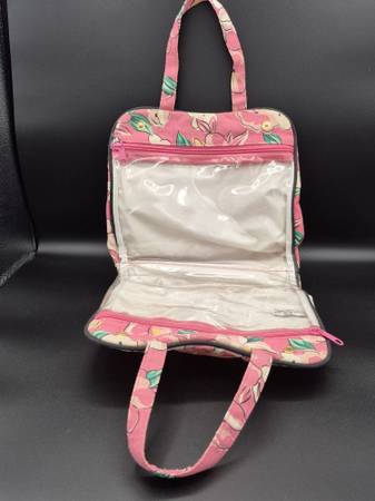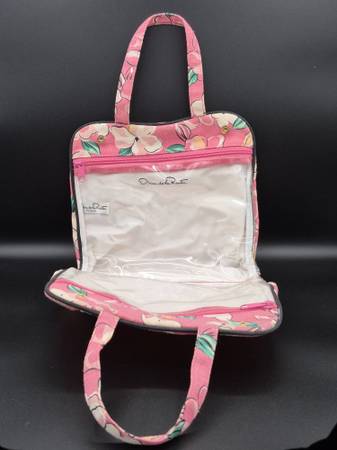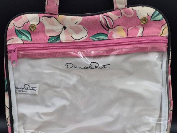 Oscar de la Renta floral make-up bag or travel bag, pink, in very good condition, some cosmetic wear on the inside, vinyl is in perfect condition, no rips. Bag measures 11x9" when snapped closed and 18x9" when opened. Exterior is cotton, interior is vinyl for easy cleaning and has 2 zippered pockets. Smoke free, pet free home.