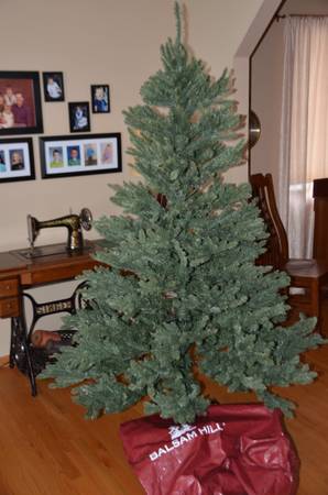 SELLING A VERY NICE 6FT + HIGH BALSAM HILL CHRISTMAS TREE. USED FOR ONLY TWO SEASONS. COMES WITH ITS STAND AND RED VINYL STORAGE CASE.