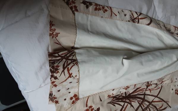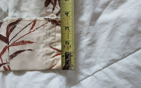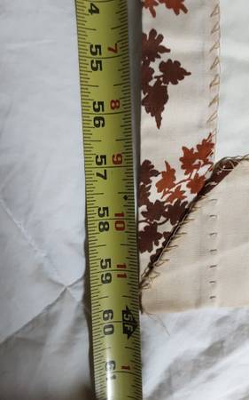Leaf and tall grass print, super nice beige curtain with red brown motif. Two panels with lining for light filtering. Requires curtain hooks. Each panel measures approximately 47 inches across by 60 inches long. Washable. Pinch pleats with hooks included!