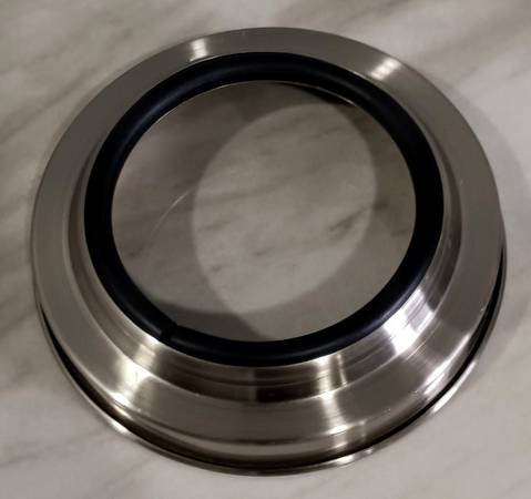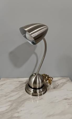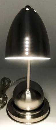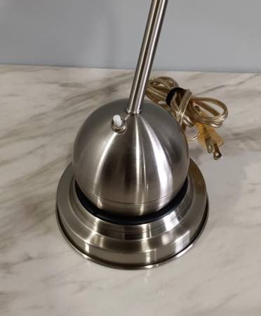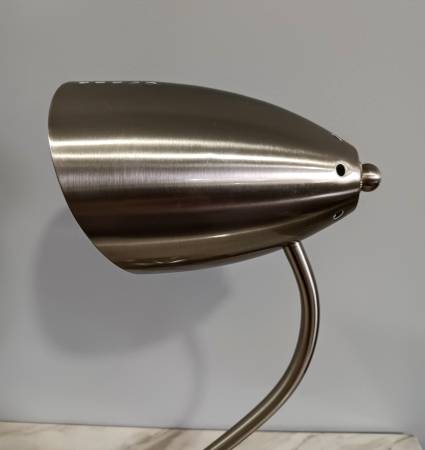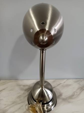 This is a modern version of the Art Deco period lamp produced by Gispen Design, The Tumbler. The shade is different shape but it has the rotating heavy ball base that allows it to be adjusted to any angle. A on/off button switch. Brushed chrome or nickel, it has some design holes in the shade.Works great. Lamp is very heavy as it is used as a counter weight for adjusting. The lamp rests on a separate metal ring shaped holder.
