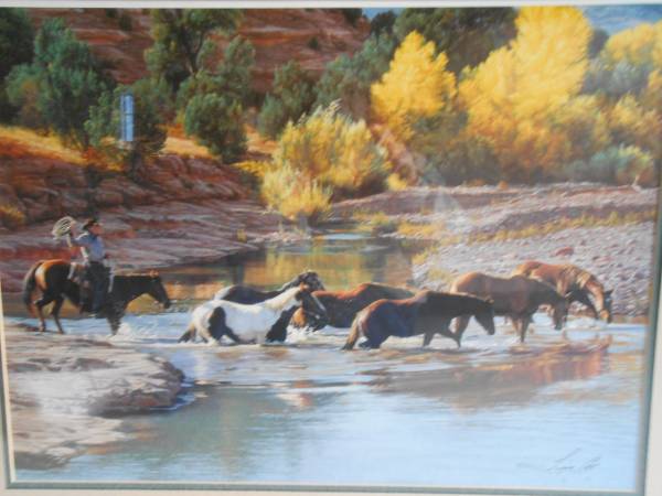 "Fresh Mounts" by Tim Cox wood framed print, 24"×18", in excellent condition, some scuffs on frame, see pic. Wire hanger on back. Heavy print, weighs just under 11 pounds. Smoke free, pet free home.
