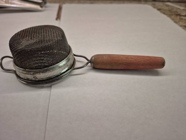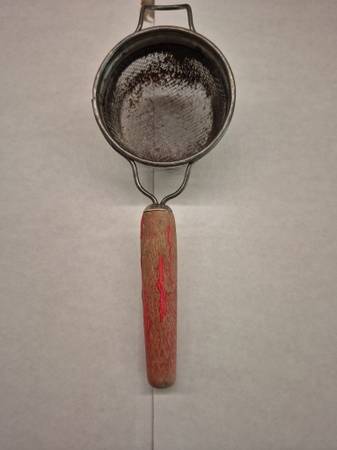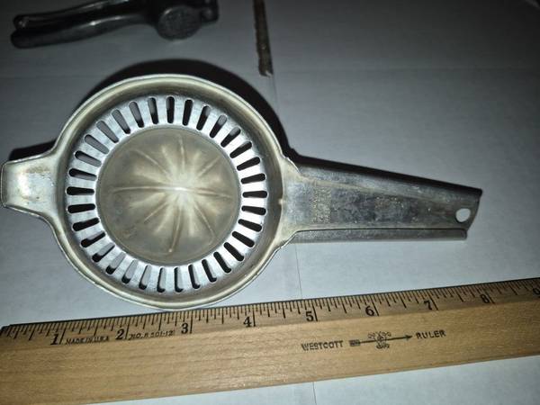 Lot Of 3 Vintage Kitchen Tools, Garlic Press Juicer & Strainer in good condition. The garlic press is in good condition, no corrosion present. The Foley juicer is in good condition, no corrosion present. The A&J tea cup hanging strainer is in poor condition, most all of the red paint on the handle has been worn off and there is corrosion present on most of the strainer. Smoke free, pet free home.