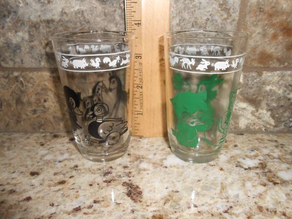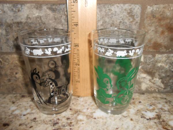 Lot of 2 Vintage Swanky Swigs juice glasses in excellent condition, no chips or cracks, graphics are excellent. The glasses are horse/duck and bunny/cat. Smoke free, pet free home.