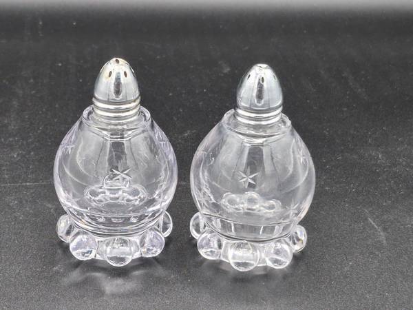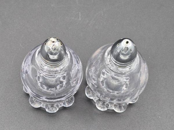 Pair of etched glass salt and pepper shakers, 3.5" with metal tops in good condition. The shakers are etched with stars/snowflakes, are ball footed, and are in excellent condition. The metal tops do have dents in them, not sure if they were Imperial tops and the very top was cut off, please see pics, they are in good condition. Smoke free, pet free home.