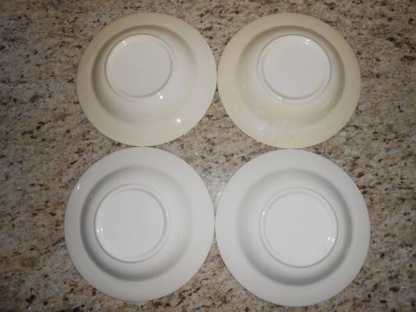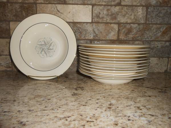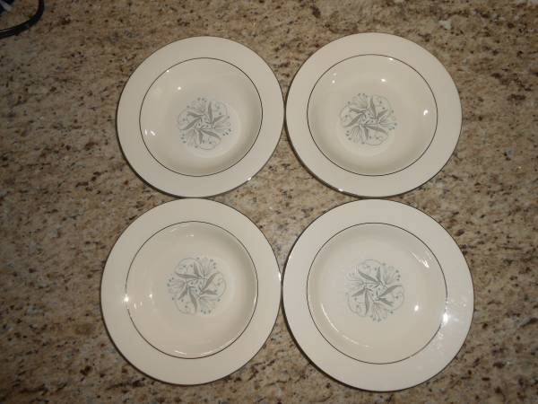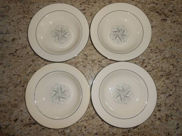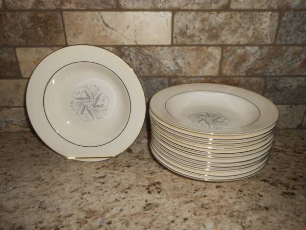 Set of 12 Homer Laughlin rimmed soup bowls, 7.25 ", Celeste. Eight of the bowls are in very good condition, no chips or cracks, most have some paint rubbed off on the outside rims. Four of the bowls have some paint imperfections, see pics, but no chips or cracks. The 4 also have some paint rubbed off the outside rim. Smoke free, pet free home.