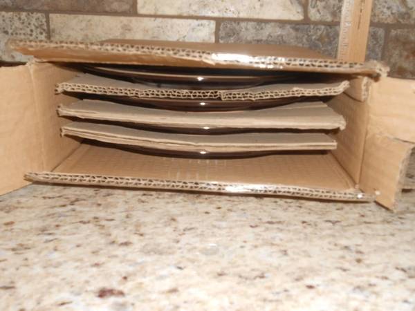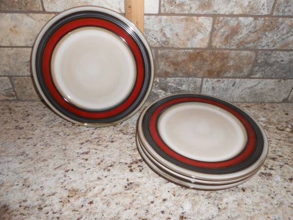 Set of 4 Gibson Elite Stoneware 8.35" Salad or Dessert Plates, Everston , Red, New/Open Box. Heavy set, weights 4.5 pounds. Smoke free, pet free home.