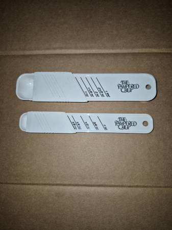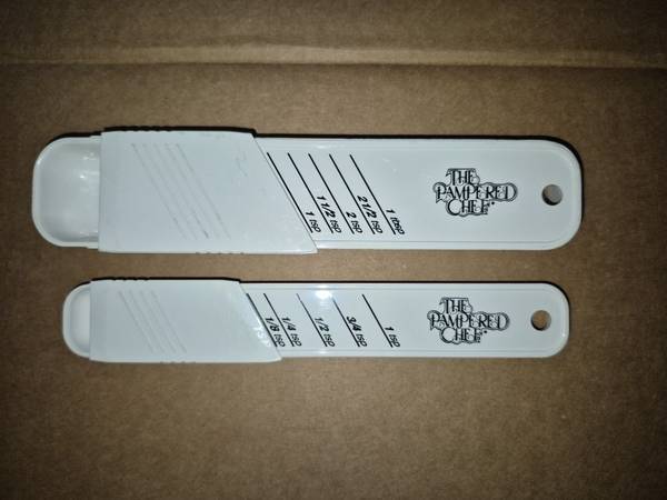 Set Of 2 Vintage Pampered Chef Adjustable Measuring Spoons, Teaspoon & Tablespoon, in good condition. Measuring Spoons range from 1/8 teaspoon to 1 tablespoon. Smoke free, pet free home.