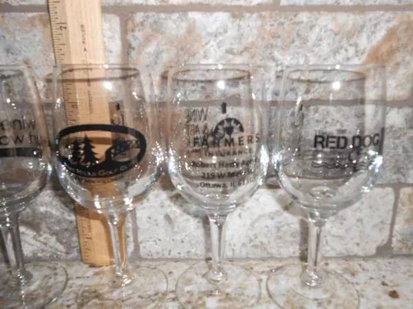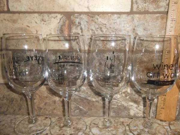 Lot of 7 Wine & Art Walk, Ottawa, IL Wine glasses with various sponsors on them. Smoke free, pet free home.