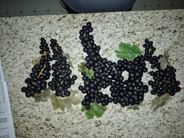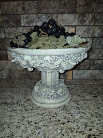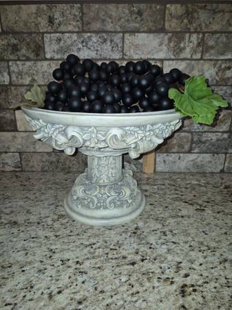 Vintage 8.5" Resin Footed Fruit Bowl with artificial grapes and greenery in excellent condition. This centerpiece is 8.5" tall, 12" with the fruit, and is 13" wide. Heavy piece, weighs over 7.5...