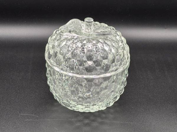 Vintage Glass apple candy dish with lid in excellent condition, no chips or cracks. This is pressed glass and has raised hexagonal faceted cut. Heavy, weighs 1.25 pounds. Smoke free, pet free home.