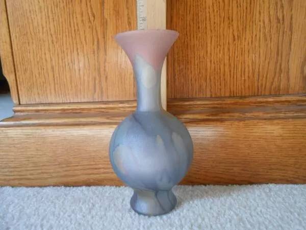 Vintage Robert Rueven satin glass handpainted drip watercolor 7" bud vase by Nouveau Art Glass Co., in excellent condition. Smoke free, pet free home.