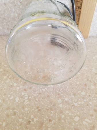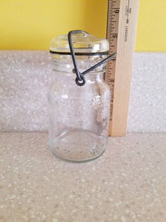 Wheaton clear glass jar with lid, rubber stopper and wire bale, flower/daisy pattern, 5" tall, 2.5" diameter in very good condition. The jar and lid are in excellent condition, the wire bale is in good condition and the rubber stopper is in poor condition. Smoke free, pet free home.