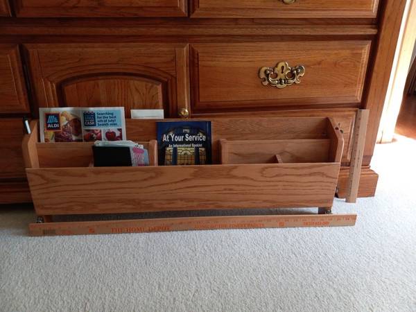 Wooden hanging wall organizer, all oak, 33"×12"×3.75", in excellent condition. Organizer has 2 screw holes to screw into the wall. The organizer has 7 individual slots, 4 pinch clips, a thin slit all along the back (holds gift cards, coupons, business cards, etc.) and 2 holes to hold pens/pencils. This organizer weight almost 12 pounds, it is high quality wood. Smoke free, pet free home.