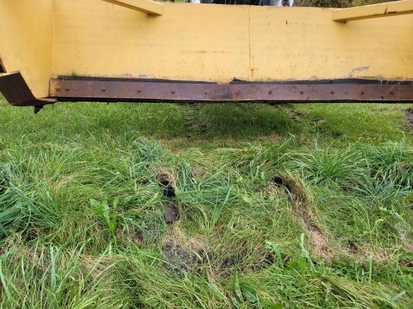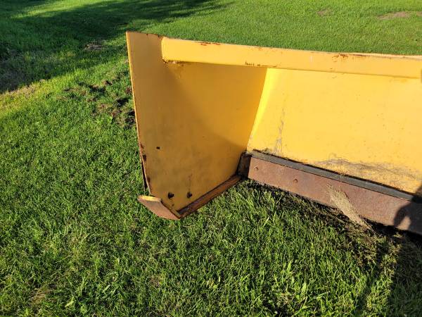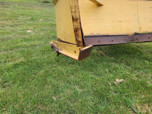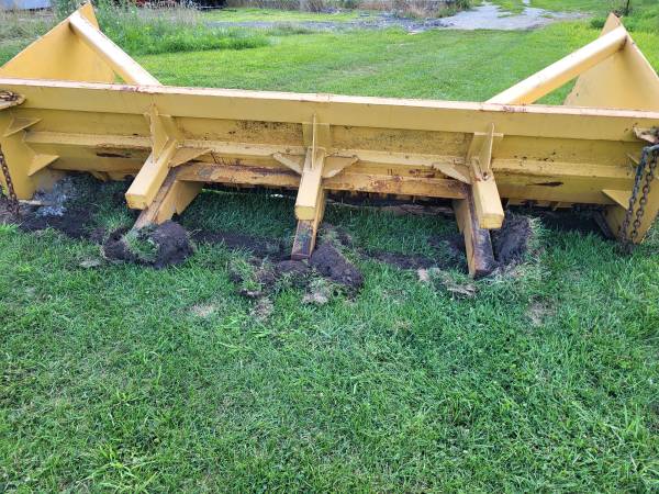 12 ft box pusher for a front end loader. Bucket hook up.. Has chains mounted. Needs some TLC on the one side. Got bent Rubber cutting edge should last the season.