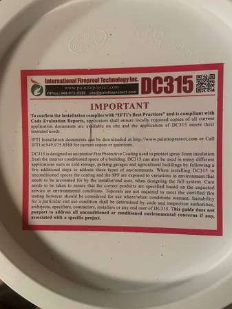 "In Illinois, DC315 is not only required for use over spray polyurethane foam (SPF) insulation. The coating is designed to provide a thermal barrier and is compliant with the International Building Code (IBC) and other national and international building codes. DC315 is tested and evaluated to meet the fire protection requirements of SPF insulation, ensuring that the insulation is adequately protected from fire hazards.