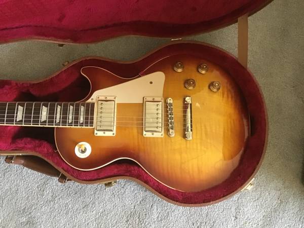 2017 made in USA, not a Chibson, Gibson Les Paul traditional model electric guitar. I purchased from guitar center in 2018. Pickups were change to 2014 dated, PAF BB pickups. Some fret wear, lots of life left. It’s been used so it has some minor dings. I don’t play it anymore and we need a new house roof so it’s got to go. Pickup at Villa Park guitar center, in Darien or Bolingbrook. Includes upgraded Gibson USA case, bench photo and various paperwork.