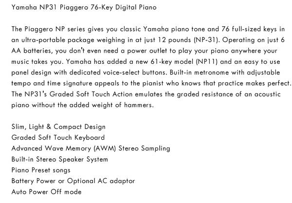 Yamaha Piaggero NP 31 keyboard in excellent condition