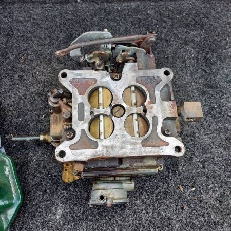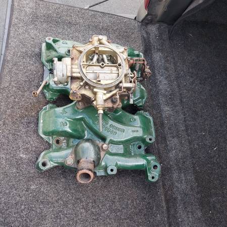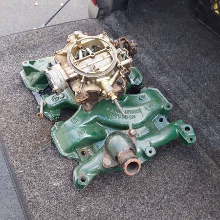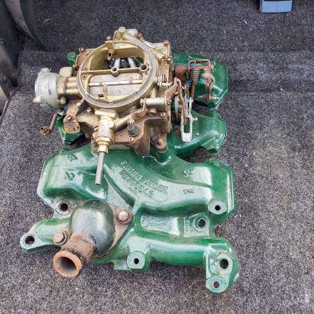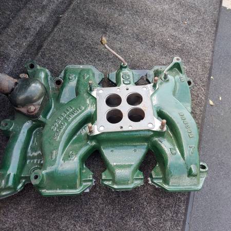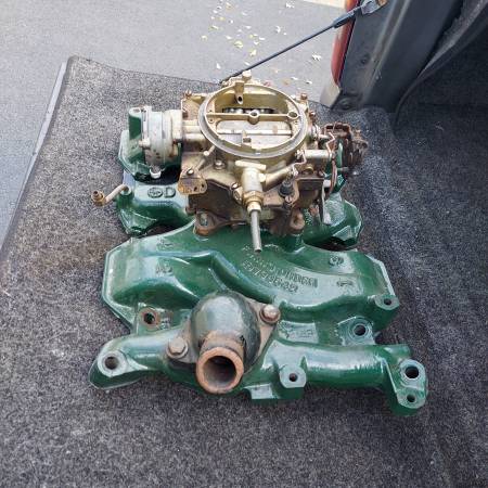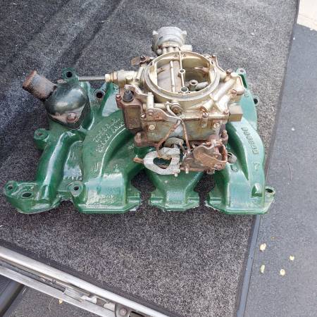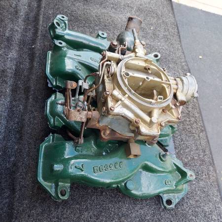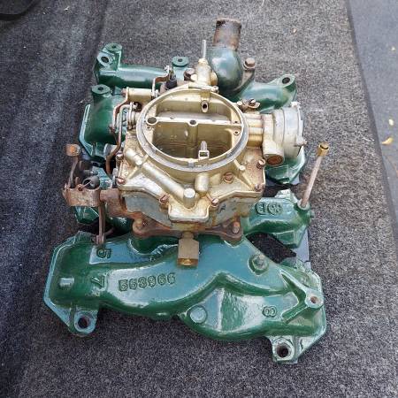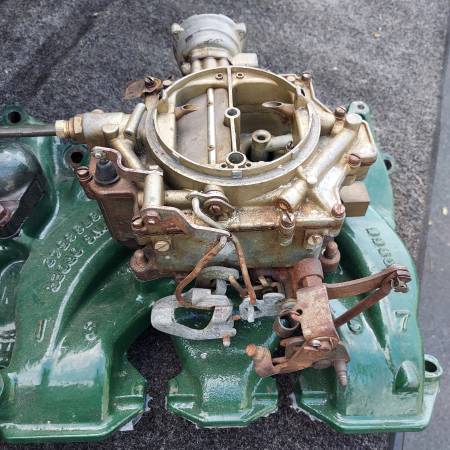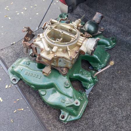 Original 1955 1956 324 part number 563966 cast iron 4 barrel intake with Rochester Dual Jet 4 barrel carburetor. Includes water neck. Removed from a running 1956 324 V8. Oldsmobile 88 98 Starfire...