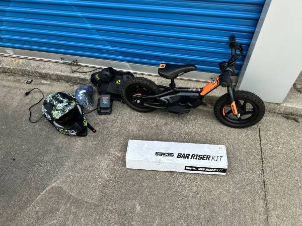 Brand new condition, 1 battery with charger, brand new youth helmet, brand new youth chest protector. Stacyc Bar Riser kit included.