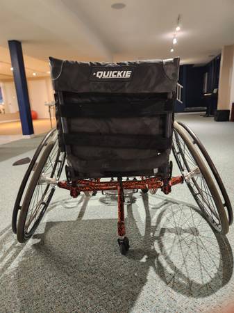 Quickie wheelchair with 18-inch wide seat, 26-inch Spinergy wheels with 20-degree camber. 5th wheel rear caster to prevent wheelies. Front bumper. Seat belt and leg strap. Bengal paint.