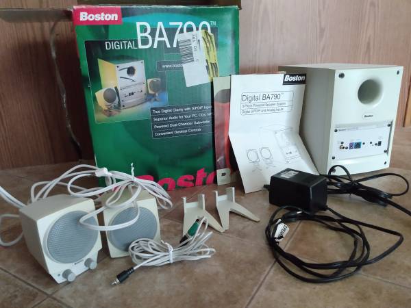 Finally selling my Boston Acoustics 3 piece sub/sat system, model BA790. Original owner bought end of 2001. Been my computer speaker system for all those years. Stayed in one place and docked. Still sounds great. Low profile that doesn't take up much space including the subwoofer which gives out good punchy bass. This system has both analog and digital inputs, the latter great for connecting to a CD, DVD, Bluray, MD, or any other music player directly that has a digital output without needing a receiver / amplifier. Everything that came in the box including the subwoofer, satellites, power adapter, manuals, cables, and box with packing material. Asking $40.00 or best offer for everything.