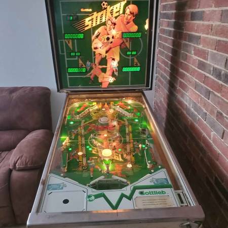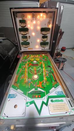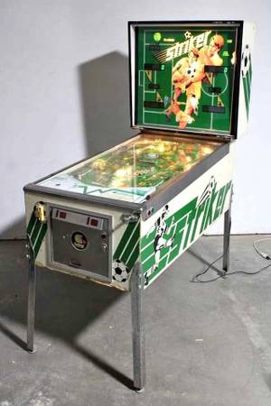 Super rare 1982 gottlieb striker. Game is working except sound stays in attract mode even after you start a game. I'm fairly certain it's the connectors to the boards (common issue with system 80 games). Ground mods have been done. There is a spot that's been poorly touched up (pictured). Some of the wiring has been repaired in the past and isn't the greatest (see the doorbell button that's been added for a credit button) but game plays just fine. It's a super fun pin with a very unique layout. I hate to get rid of it but it's come to that time. More pics available. No trades, need cash