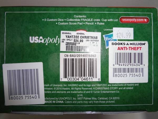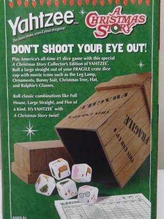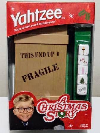 A Christmas Story Yahtzee Game Included: 1 Collectible Fragile Crate Dice Cup 5 Custom Dice Featuring Movie Icons 1 Custom Score Pad 1 Pencil Instructions Call or Text #