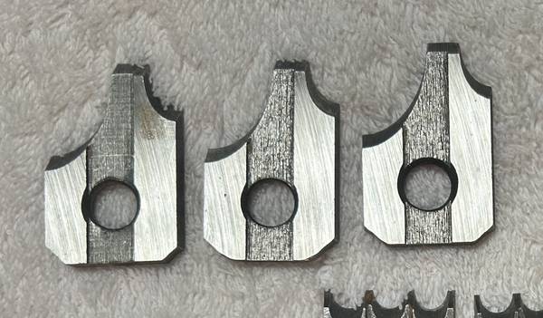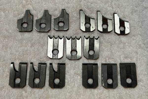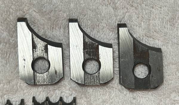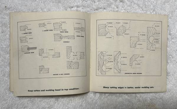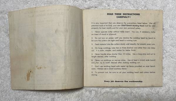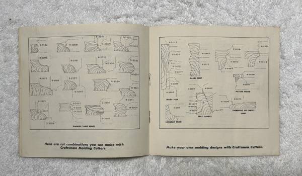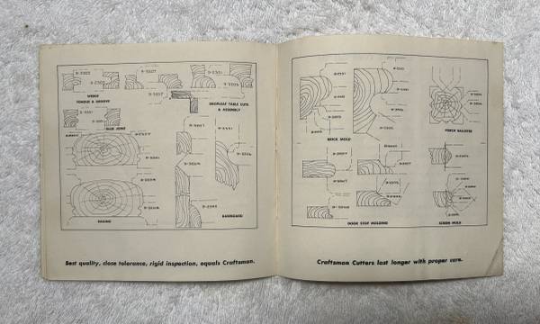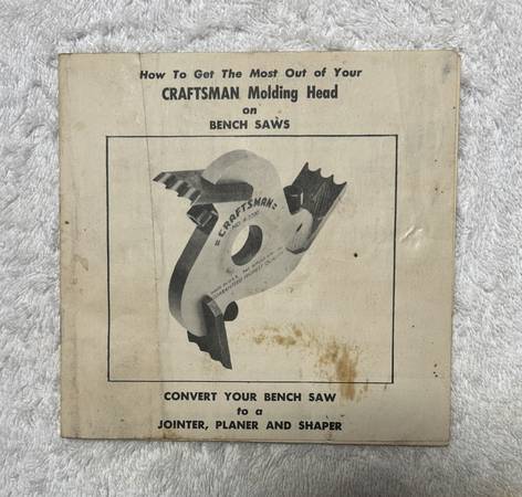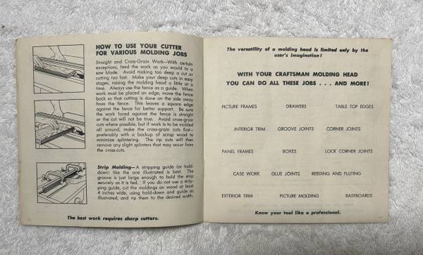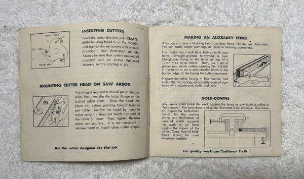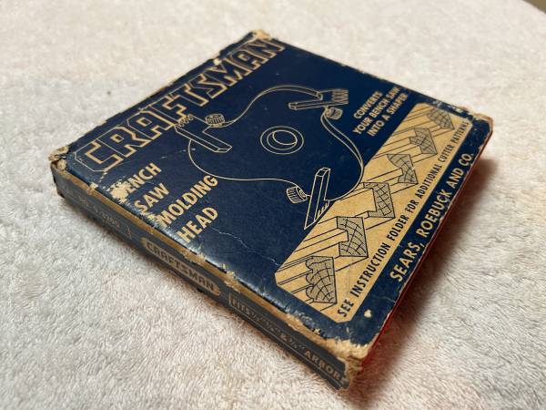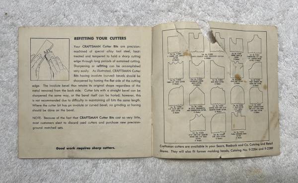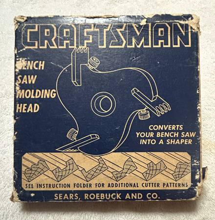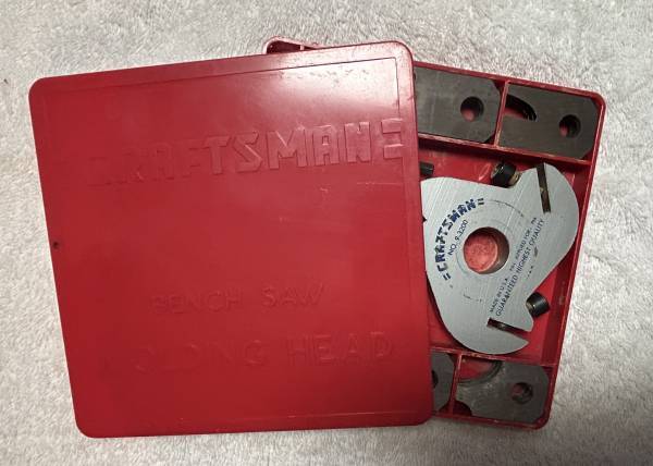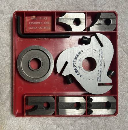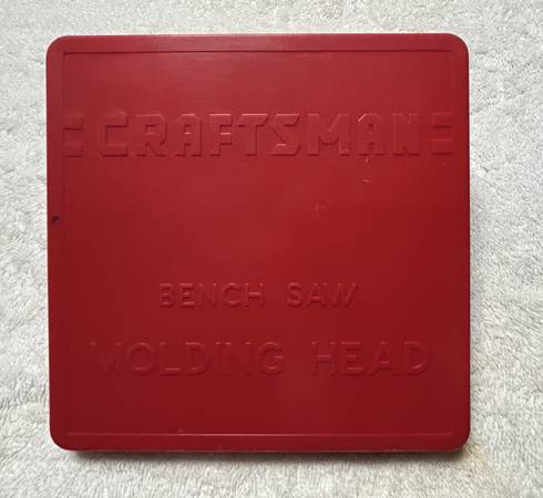 Sears Craftsman molding head with 5 sets of cutter bits, in original plastic storage case and cardboard sleeve. Catalog no. 9-3200. See photos for shapes. Lightly used and in excellent condition. The cardboard sleeve and 16-page instruction manual are in good condition, but show wear. See photos. Made in U.S.A. by Craftsman.