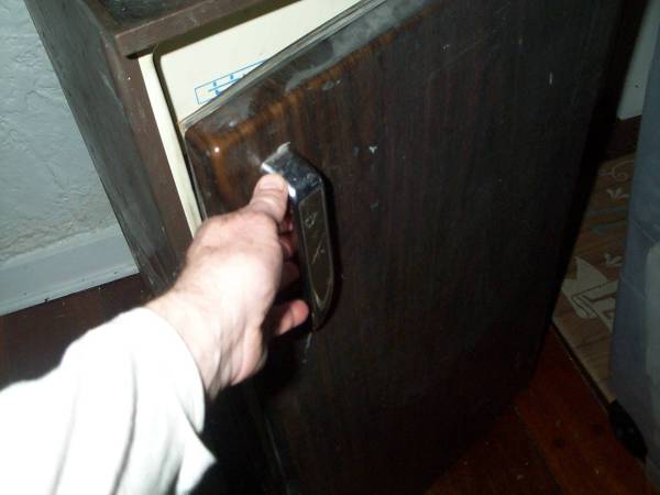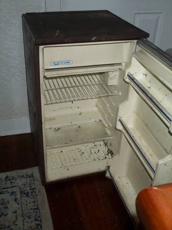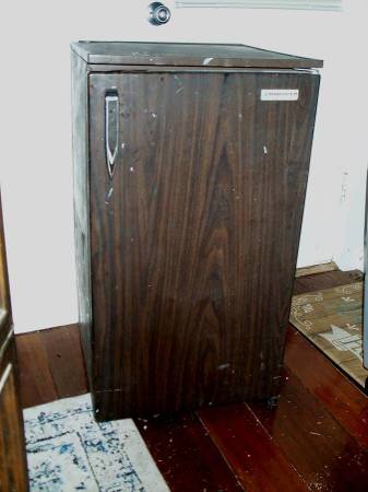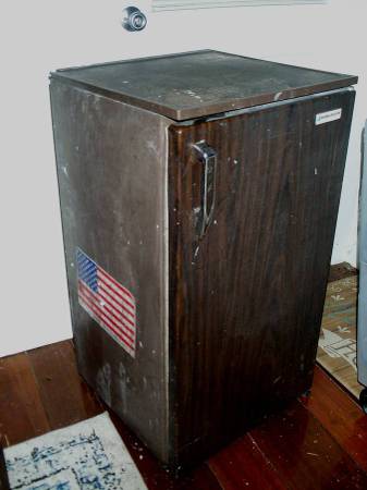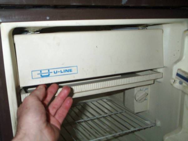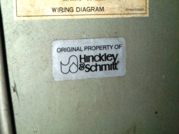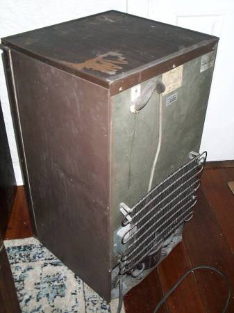 Works! Compact size refrigerator and top shelf freezer. Manufactured by U-Line for the infamous Hinkley & Schmitt water company back in the day. Tested and the fridge and freezer cool nicely. Variable thermostat. Fridge would benefit from some cleaning. If you collect Hinkley & Schmitt...this is a very rare and useful item. You will probably never see another refrigerator branded this way. Model UR-45-1. 235 PSI. Unit measures aprox 18 10/16" wide x 19" deep x 33" height. Pick up from North Aurora, IL. Please call or text show contact info