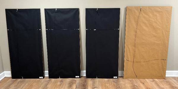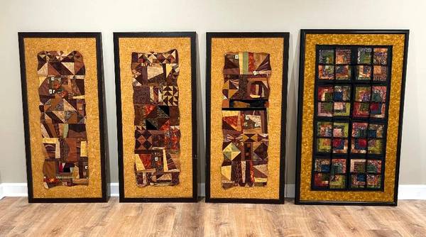 This listing is for 4 - Large Wall Hanging Textile / Patchwork / Tapestry / Artwork - CUSTOM MADE & FRAMED. Three of these art pieces measure 25" x 53", and the larger piece measures 32" x 54". All of these pieces can be mounted on the wall either horizontally or vertically! Each piece has different patchwork pieces that are stitched together. VERY UNIQUE!!! These pieces were framed by COLBERT CUSTOM FRAMING in NAPERVILLE, IL.
