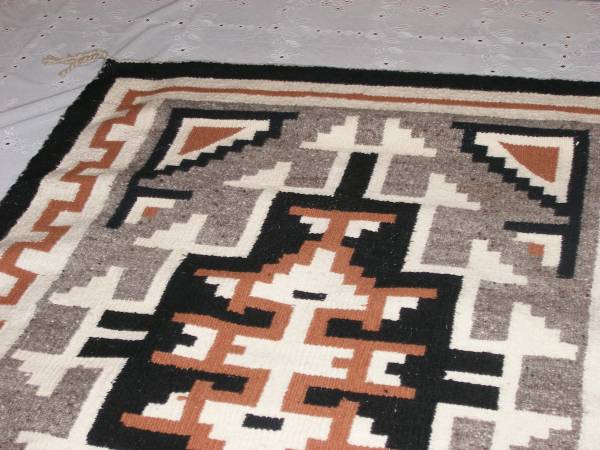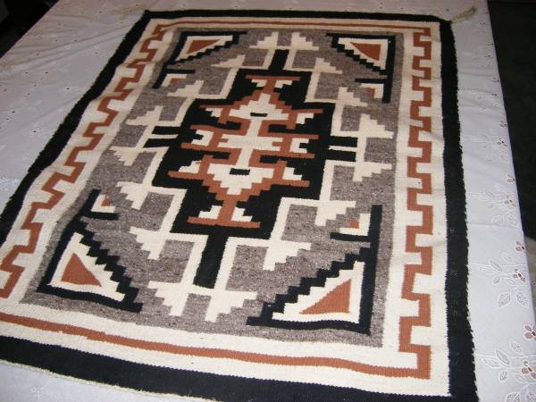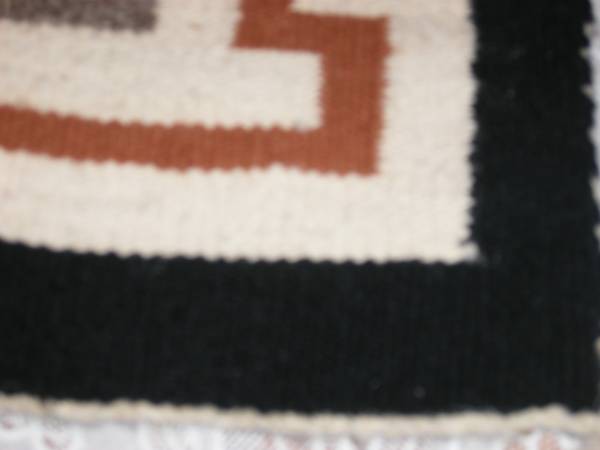 This rug is a "Two Grey Hills" pattern. Two Grey Hills rugs are made with natural wools combined together to make the different colors rather than using different dyes. Therefore they are more expensive and highly prized by collectors. This rug measures 35.5" long and 27" wide. It is in excellent condition.