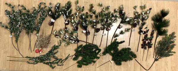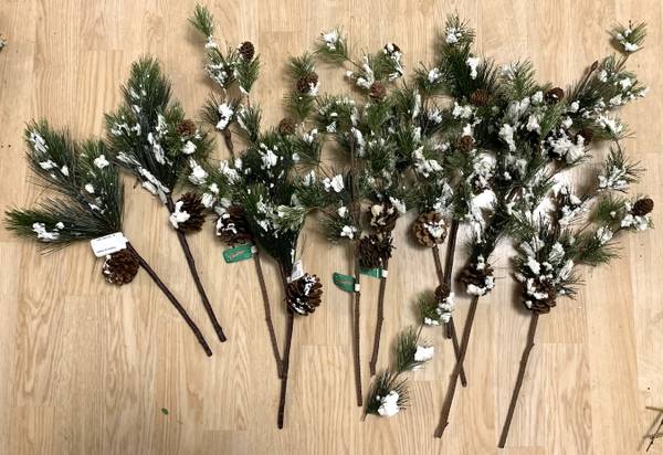 - 8 styrofoam flocked artificial pine sprigs / picks (17-20")