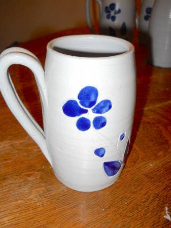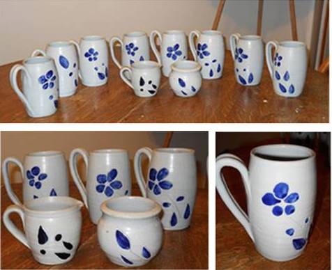 10-Piece Williamsburg Pottery / Glazed Cobalt Flower / Tall Tulip Salt Glaze Coffee Set. Williamsburg VA Stoneware Pottery 1995 • 8 Tall coffee mugs (5" High x 3-1/2" Wide) • 1 Sugar bowl (3-1/2"...