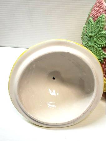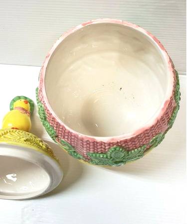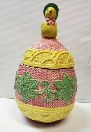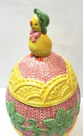 This Easter Egg Cookie Jar is the perfect addition to your holiday decor. Ceramic jar is shaped like an egg and comes in a textured pink, green, and yellow finish. The lid features an adorable chick sitting on top.